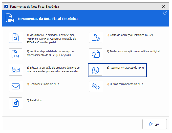 Para reenviar uma nota para um cliente, utiliza-se a opção 8 do menu FAT 2.3-G.