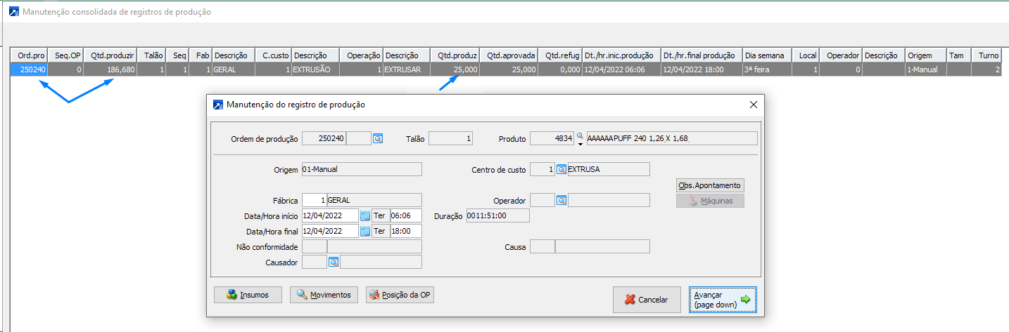 Nesse exemplo foi apontado quantidade de 25 M2, numa OP de 186,680 M2.
