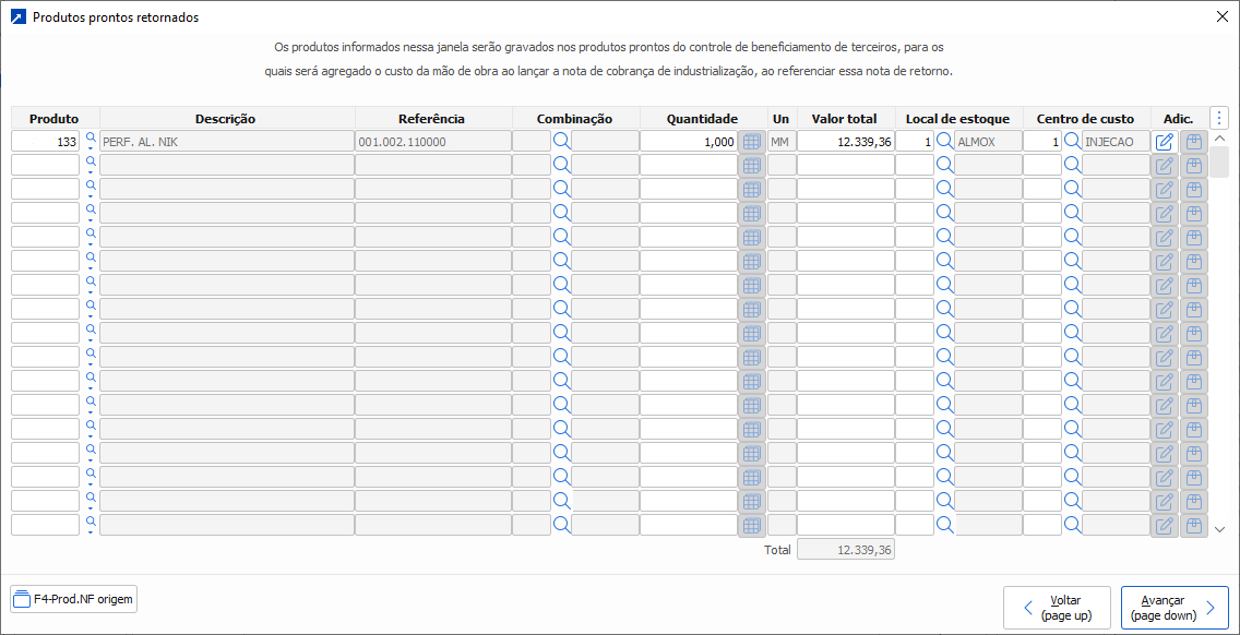 No botão [F4-Prod.NF origem] - que é criado somente se a CFOP de origem for de industrialização - é possível selecionar os produtos prontos retornados a partir de um grid dinâmico.