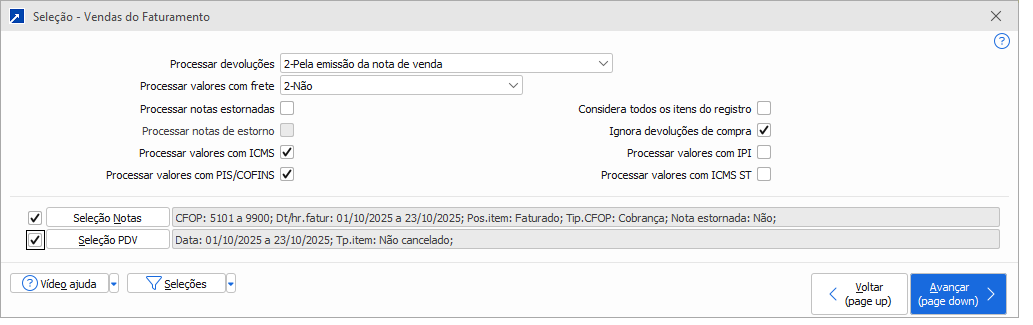 Esta é a mesma seleção padrão que é listada em vários relatórios do módulo de vendas e faturamento do SIGER®.