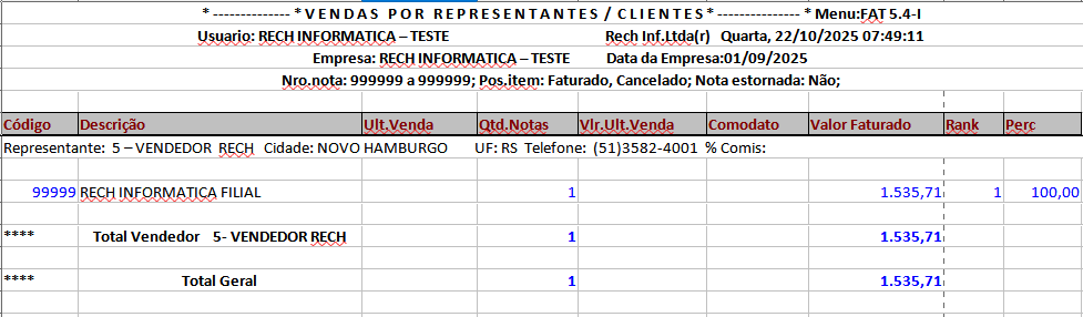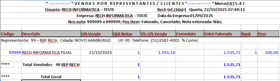Em um exemplo > esta sendo filtrado a Nota 99999 com mais de um comissionado, por exemplo possui Código representante 99 e Código vendedor 5.
