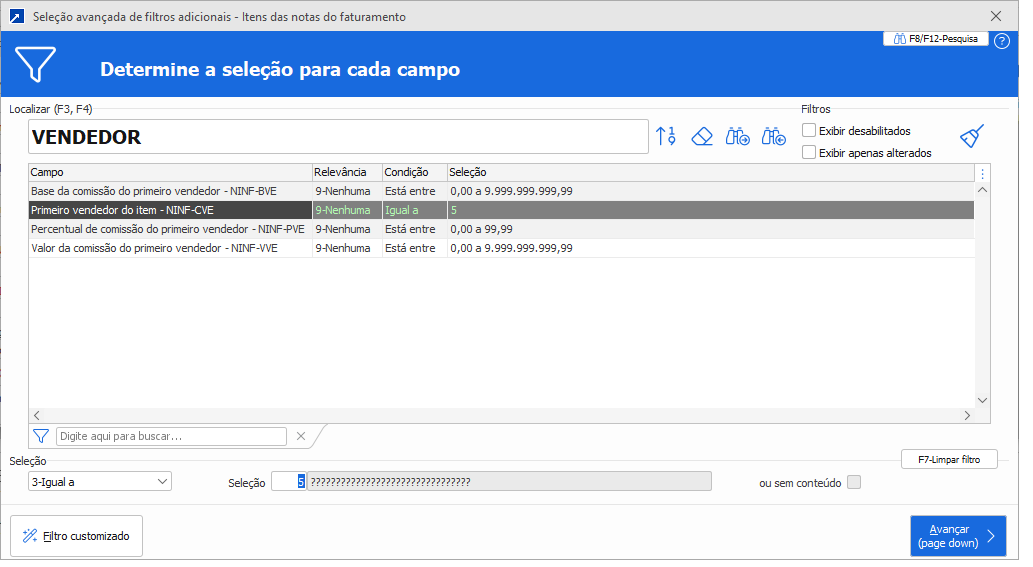 ![]() Para listar a venda no nome do vendedor, precisa filtrar dentro do Botão [Notas] > No Botão [Filtros Adicionais] > campo "primeiro vendedor do item" > Indicar na Seleção 3-Igual a (5) ou opção 5-Maior que (0)