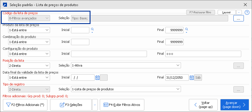 Acessando o menu FAT 2.8-B o SIGER® exibe a "Seleção padrão - Lista de preços de produtos", a qual o campo "Código da lista de preços" é desabilitado, este campo filtra especificamente o tipo de lista Base, conforme demonstrado na imagem a seguir. Nessa seleção estão disponíveis campos que possibilitam diversas seleções dependendo do cenário da empresa, como exemplo, grupo de produtos, códigos de produtos, entre outros.