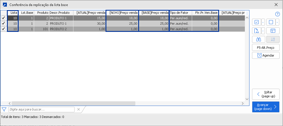 Serão carregados todos os produtos das listas de preços vinculadas à lista de preço base, na coluna "[Atual]Preço venda" é exibido o preço atual na lista de preço, na coluna "[Novo]Preço venda" é exibido o novo preço ou o preço que será replicado para lista de preços, na coluna "[BASE]Preço venda" é exibido o preço da lista base e na coluna "Ftr.Pr.Ven.Base" é exibido o percentual de aumento ou redução que será aplicado ao preço da lista base.