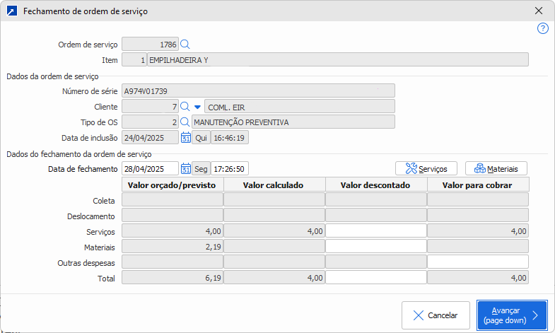 Retirada de Materiais no Fechamento do Item da OS