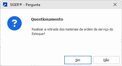 Ao avançar na janela de fechamento (abaixo), será exibida mensagem solicitando confirmação da retirada dos materiais do estoque.