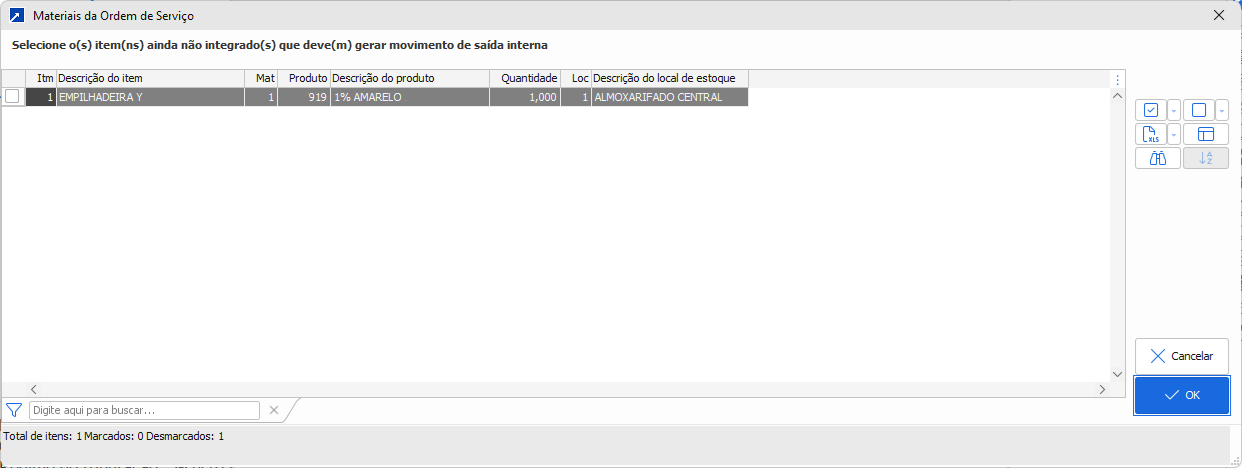 Se o "Tipo de integração com estoque" for "2-Seleciona saída interna no fechamento" (+Saiba mais), será exibida a janela/grid abaixo para que o usuário possa selecionar os materiais que deseja fazer movimento de saída interna para os materiais do Item da OS.