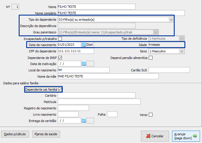 No SIGER® a configuração do dependente é no cadastro do funcionário MENU 1.8-D, botão <Alterar> botão <Dependente> botão <Incluir> e informar os dados do dependente e marcar a flag "Dependente sal.família".