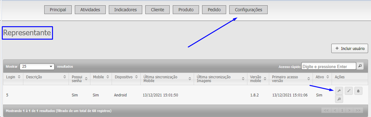 Após efetuar o login será necessário configurar cada um dos representantes que irão utilizar o aplicativo MOBILE. Acessar a opção "Configurações", "Representantes" e selecionar o representante que será habilitado. Clicar no ícone da "chave" para acessar as opções.