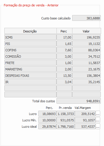 Demonstra a configuração do formação do preço de venda pela última vez que foi propagado. Podendo-se utilizar como base comparativa para o custo atual.