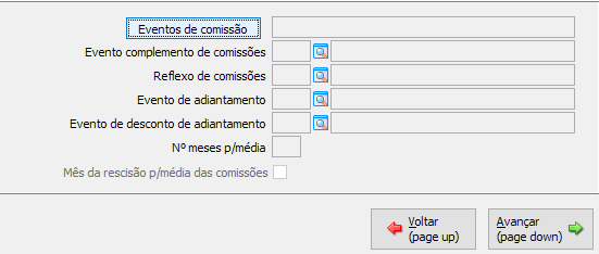 Botão comissão, utilizado para configurar os eventos para calculo de comissão, complemento, reflexo e adiantamento, assim como definir a media para cálculo das variáveis de férias e 13º salário. Para configurar funcionário comissionado, clica no link .