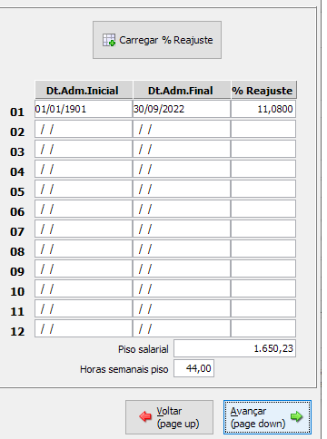 Botão utilizado para aplicar o reajuste salarial integral ou proporcional pela data de admissão de de acordo com a data base, exemplo: reajuste de 11,08 para todos os funcionários que foram contratados entre as datas 01/01/1901 a 30/09/2022.