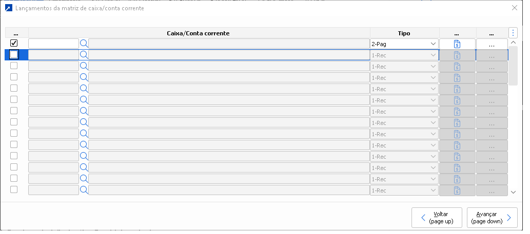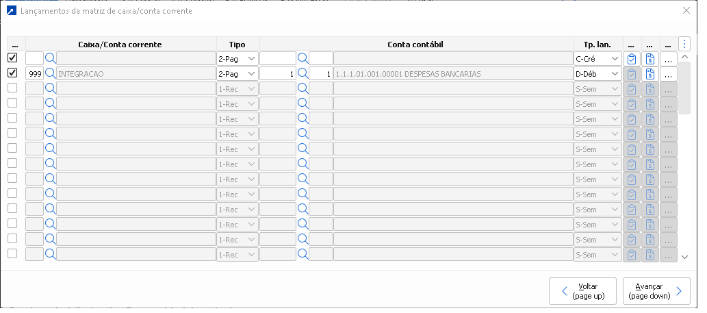 Obs.: Para as despesas é suficiente apenas uma matriz de lançamentos para todos os bancos, enquanto que nas transferências é necessário diversas matrizes conforme entrada ou saída e banco para transferência. Quando empresa não integra na contabilidade basta não informar o tipo de lançamento e a conta contábil.