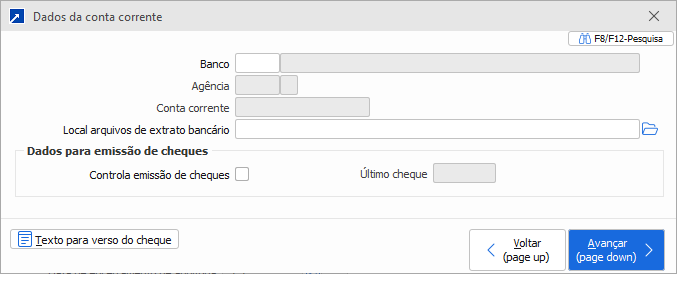 Botão com os dados bancários da conta que serão utilizados na rotina de importação de extrato bancário e para emissão de cheques.