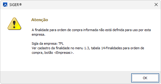 Tabela genérica de finalidade para operação de compra (finalidade de Ordem de Compra), menu 1.3-I, tabela 14. Também disponível no menu 1.3-M de manutenção consolidada.