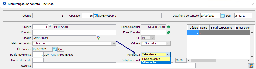 Vide abaixo campo de pendência que é aberto na criação do contato dependendo da configuração
