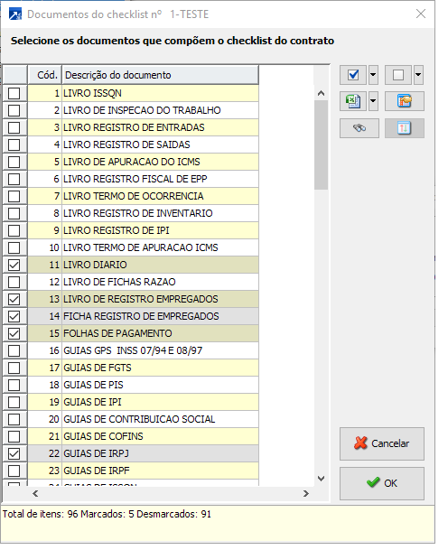 Tabela genérica de checklist dos cocumentos do contrato, menu 1.3-I, tabela 94. Também disponível no menu 1.3-M de manutenção consolidada.