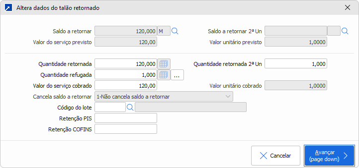 Ao indicar que não houve quantidade retornada para o talão, deve ser informada quantidade não utilizada nos insumos (insumos retornados sem uso) para geração do movimento fiscal com CFOP 1903/2903.