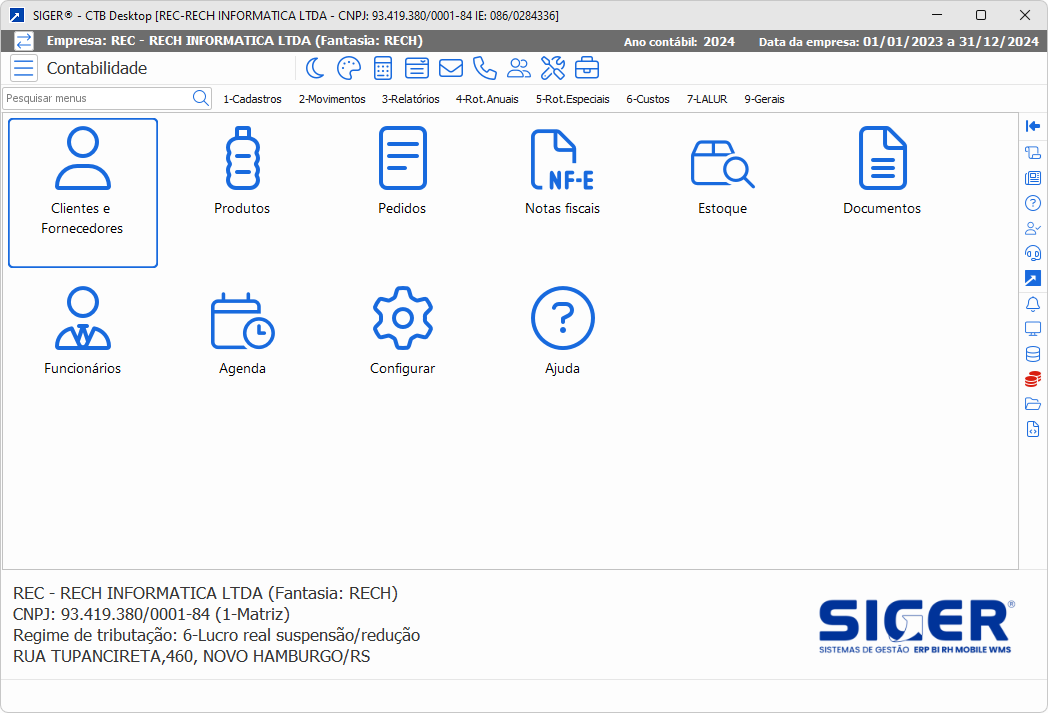 Após escolher um módulo para execução, você entra na janela específica principal do módulo selecionado. Esta janela disponibiliza as funcionalidades de um módulo do SIGER®.