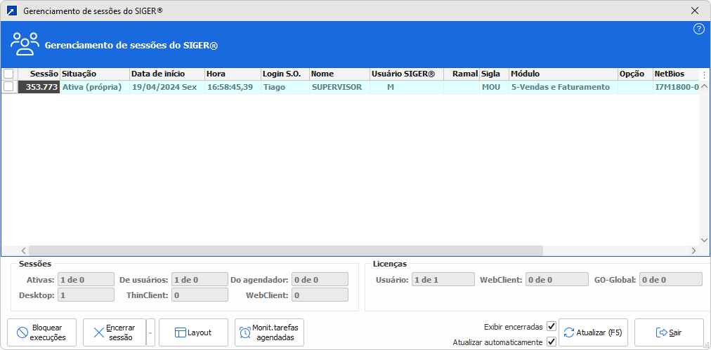 Sessões abertas no SIGER®.