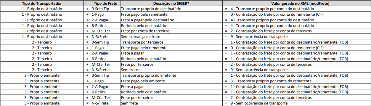 O sistema realiza automaticamente a conversão para a modalidade correta de frete no XML (tagmodFrete), a partir da combinação de dois campos: