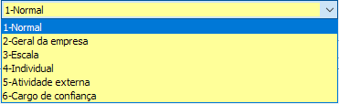 No campo TIPO indicamos o tipo de horário, em regra geral selecionamos a opção “1-Normal”, sendo assim os dias de escala não abrem, pois indicamos que aquele horário é de fato definido, e não sofre alteração como uma escala.