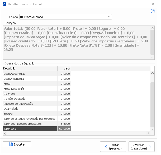 Exibe o detalhamento do cálculo do valor. Demonstra a equação do cálculo e o valor de cada operando em separado, podendo ser exportado para Excel e assim facilitar a conferência.