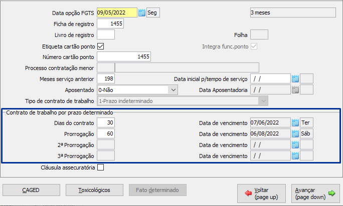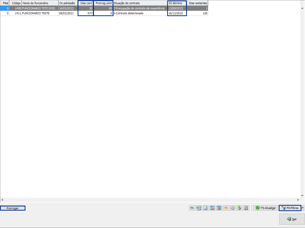 Menu FPA 5.5-C - Controle consolidado de vencimento de contrato, demonstra o vencimento do contrato e prorrogação, permite fazer filtros no botão [F9-Filtros] e tem o botão [Prorrogar], que permite prorrogar o contrato de experiência, com opção de gerar em Excel.
