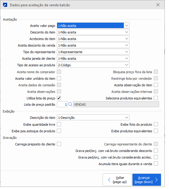 Nesse Botão pode ser configurado os dados para aceitação da Venda balcão.
