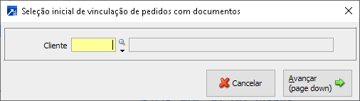Ao acessar o menu será exibida a janela "Seleção inicial de vinculação de pedidos com documentos", informe o código do cliente para iniciar a vinculação, estão disponíveis vários atalhos para pesquisar o cadastro.