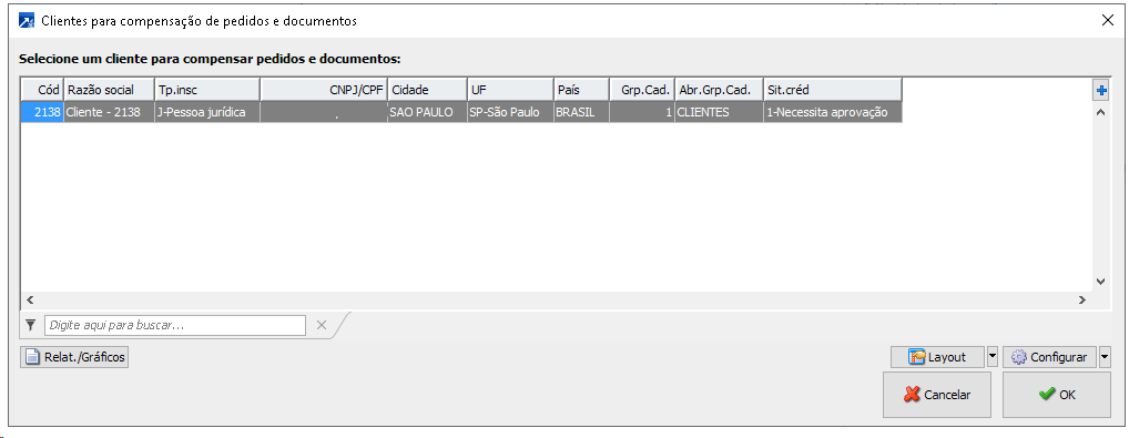 2-Cadastros com compensação pendente/efetuada: Busca os cadastros com pedidos e documentos válidos para compensar, sendo estes com valor disponível ou com compensações já gravadas. Ao avançar será exibida a janela "Clientes para compensar pedidos e documentos", conforme exemplo na imagem anterior, selecionar o cliente e clicar no botão [OK].