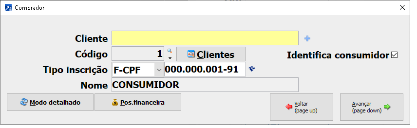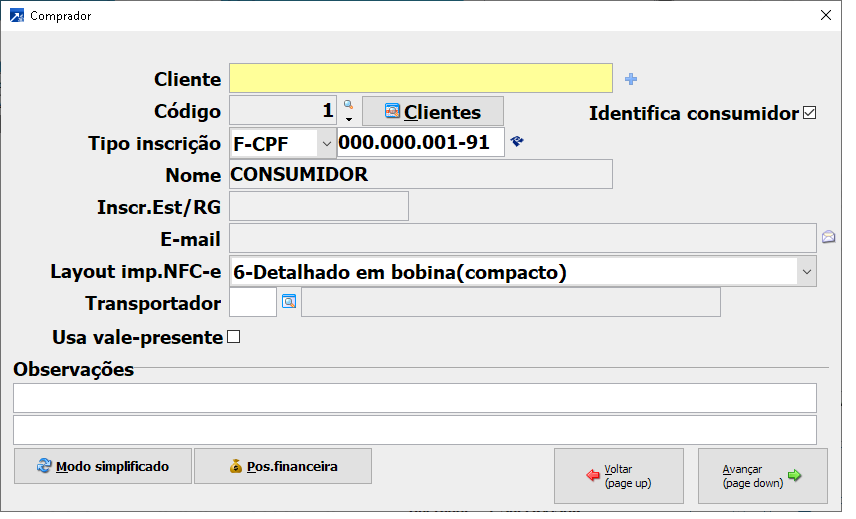 Aceita comprador: Nesta tela são inseridas as informações de identificação do consumidor. É possível inserir observações ou ainda verificar a posição financeira do cliente + Saiba mais.