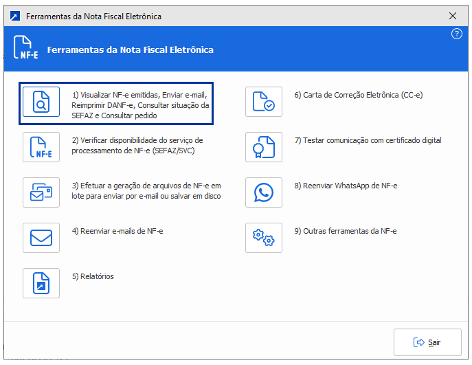 A primeira ferramenta da NF-e disponível no menu FAT 2.3-G, agrupa algumas das funções mais utilizadas da Nota Fiscal Eletrônica, como a consulta da nota, reenvio do e-mail da NF-e e emissão da Carta de Correção.